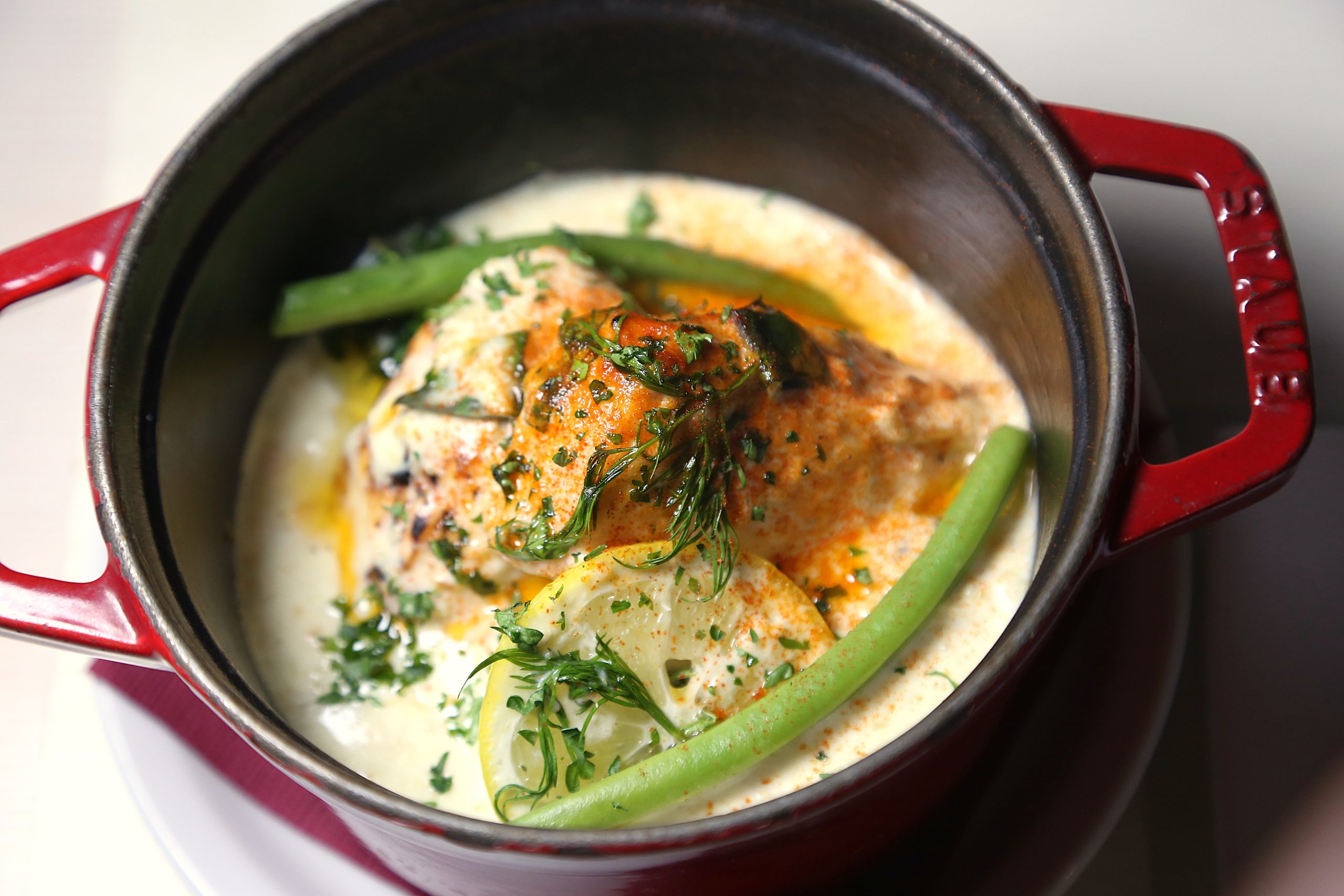 複数のハーブとレモンを飾り香りも食欲をそそる、STAUB鍋のほっと温まる一品です。