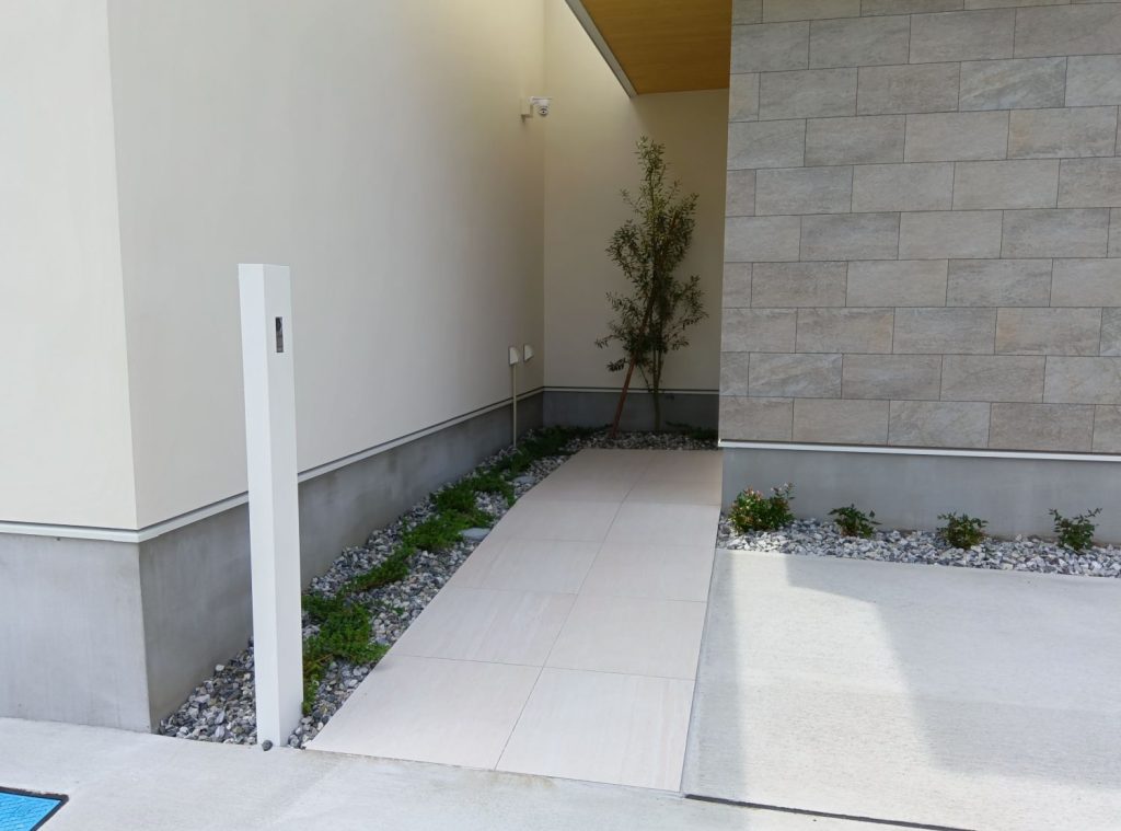 ベージュ系の優しい色味のタイル張りのアプローチは清潔感を与え、日陰になる部分も暗い印象を打ち消しています。