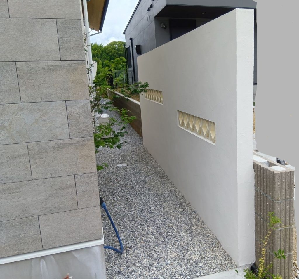 隣地側の側面はご家族のプライバシーを守るため、建物にも使われている塗り壁の塀にしています。