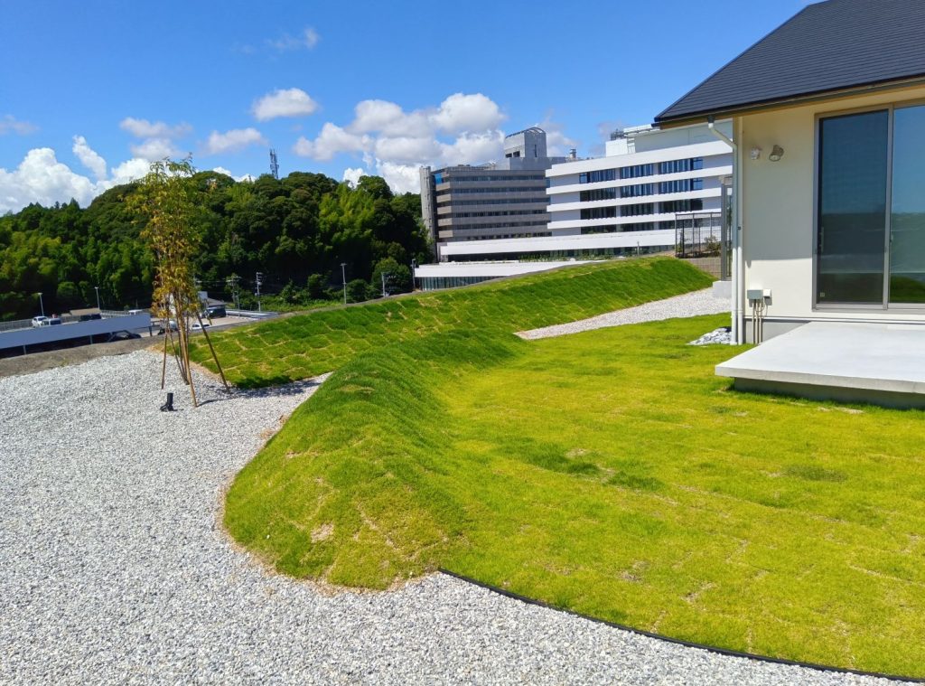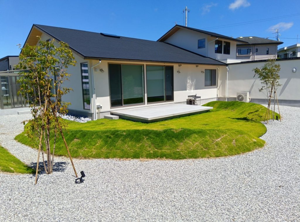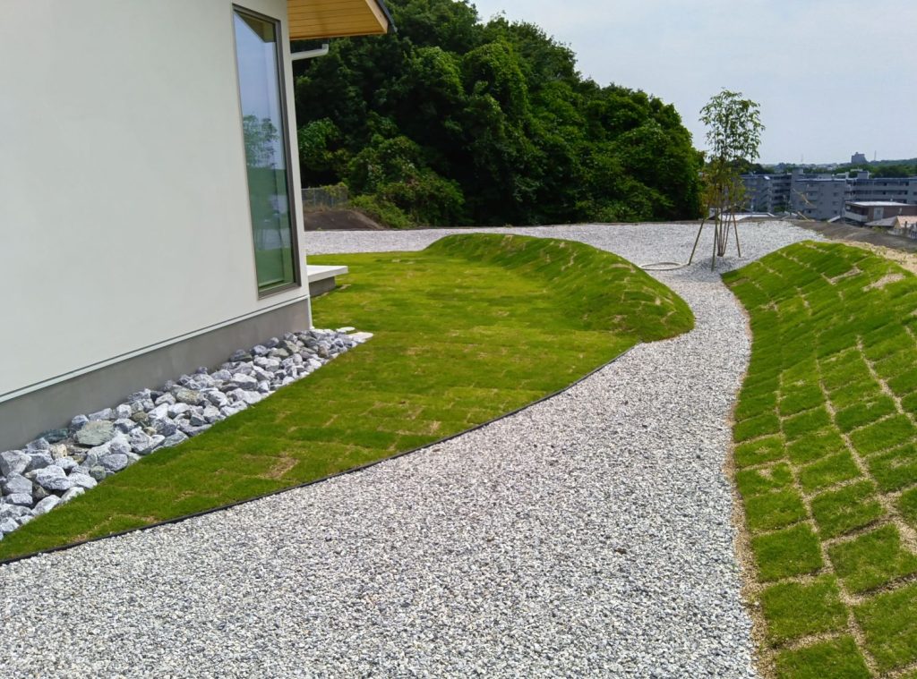 芝生を張ってから初めての夏ですが、お施主様が水やりをこまめにやってくださっているおかげできれいに青々と育っています。