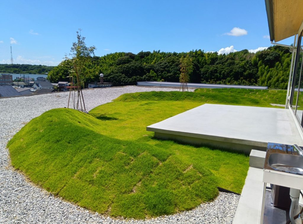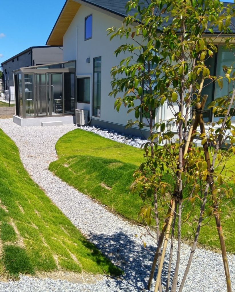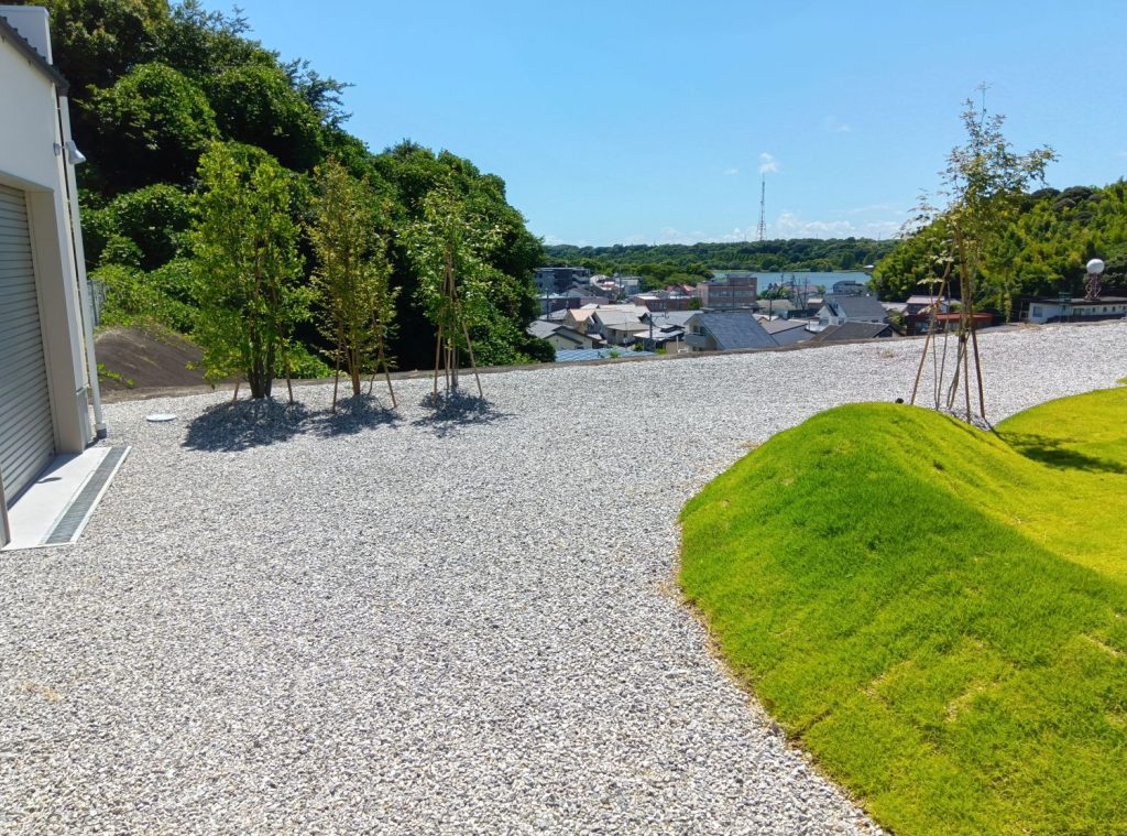 砂浜を思わせる明るい白砕石で周囲を囲い、防草(雑草対策)と共に芝生の美しい緑と蒼穹を引きたてています。