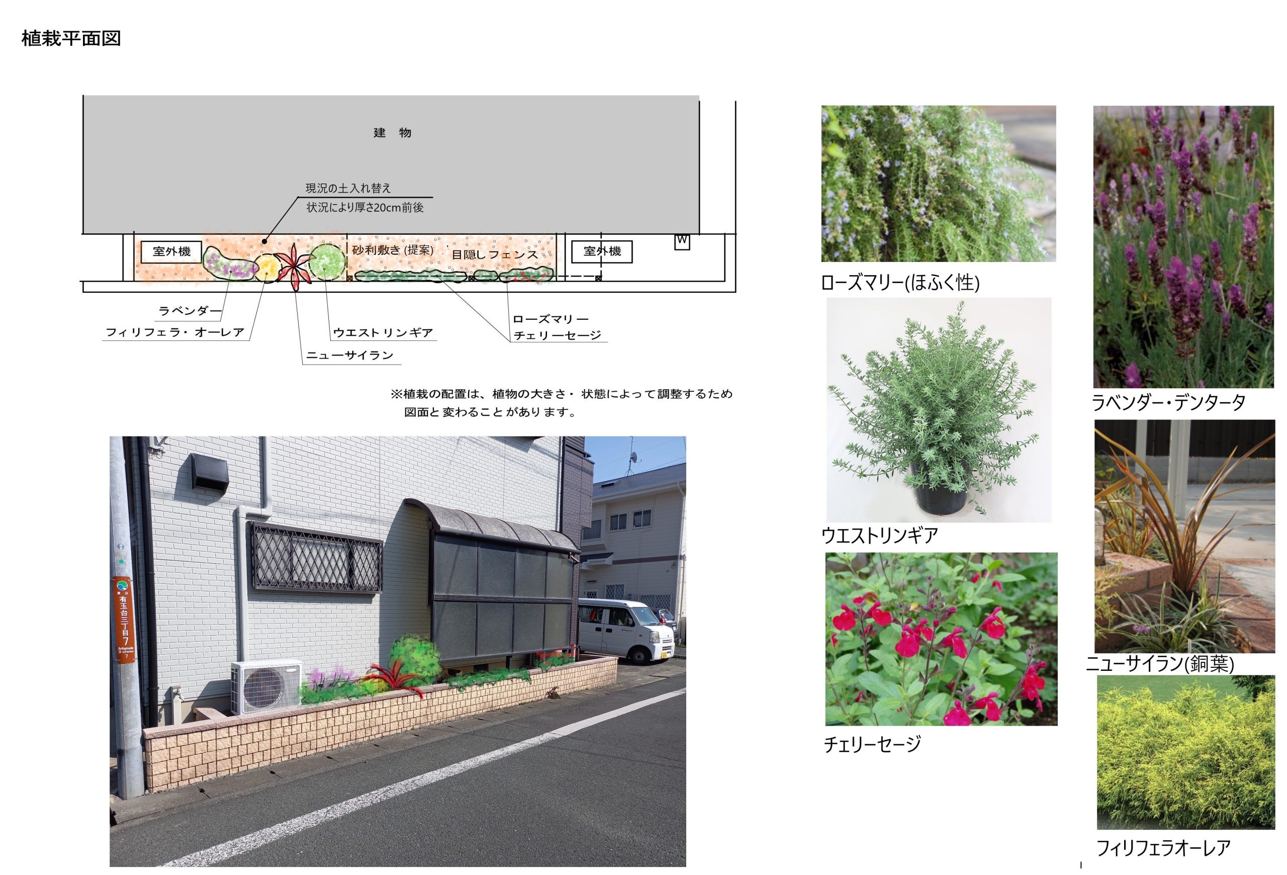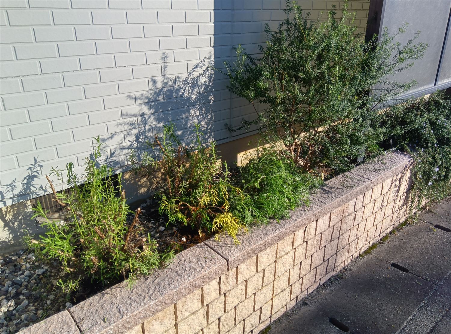 西日が強く、乾燥しやすい花壇でしたので、ハーブなどドライな環境で育つ植物の植え込みをご提案。