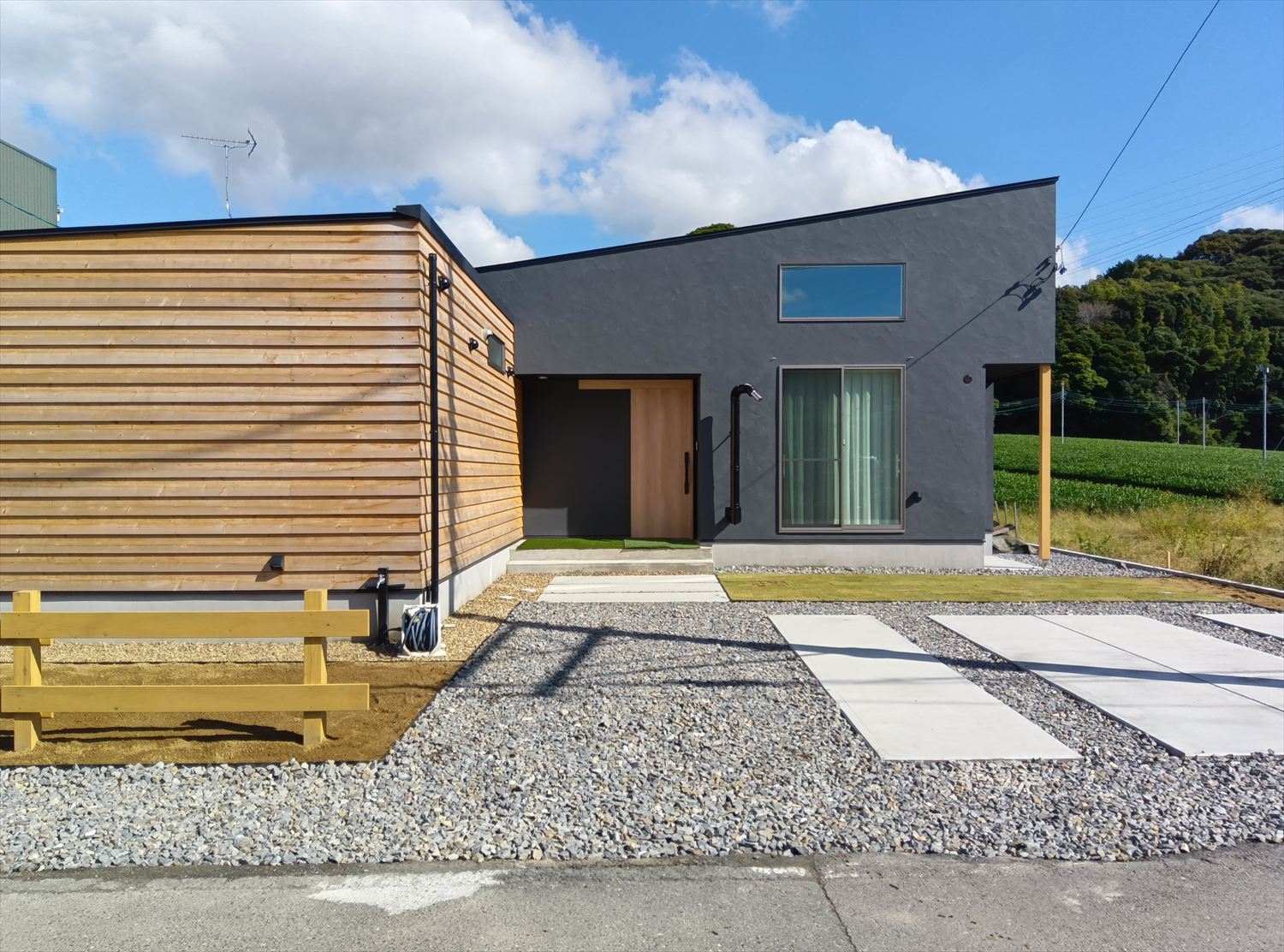 家の表側は、周りの景色に溶け込むように、あまり作りこまず、駐車場、アプローチなど必要最小限の整えとしました。