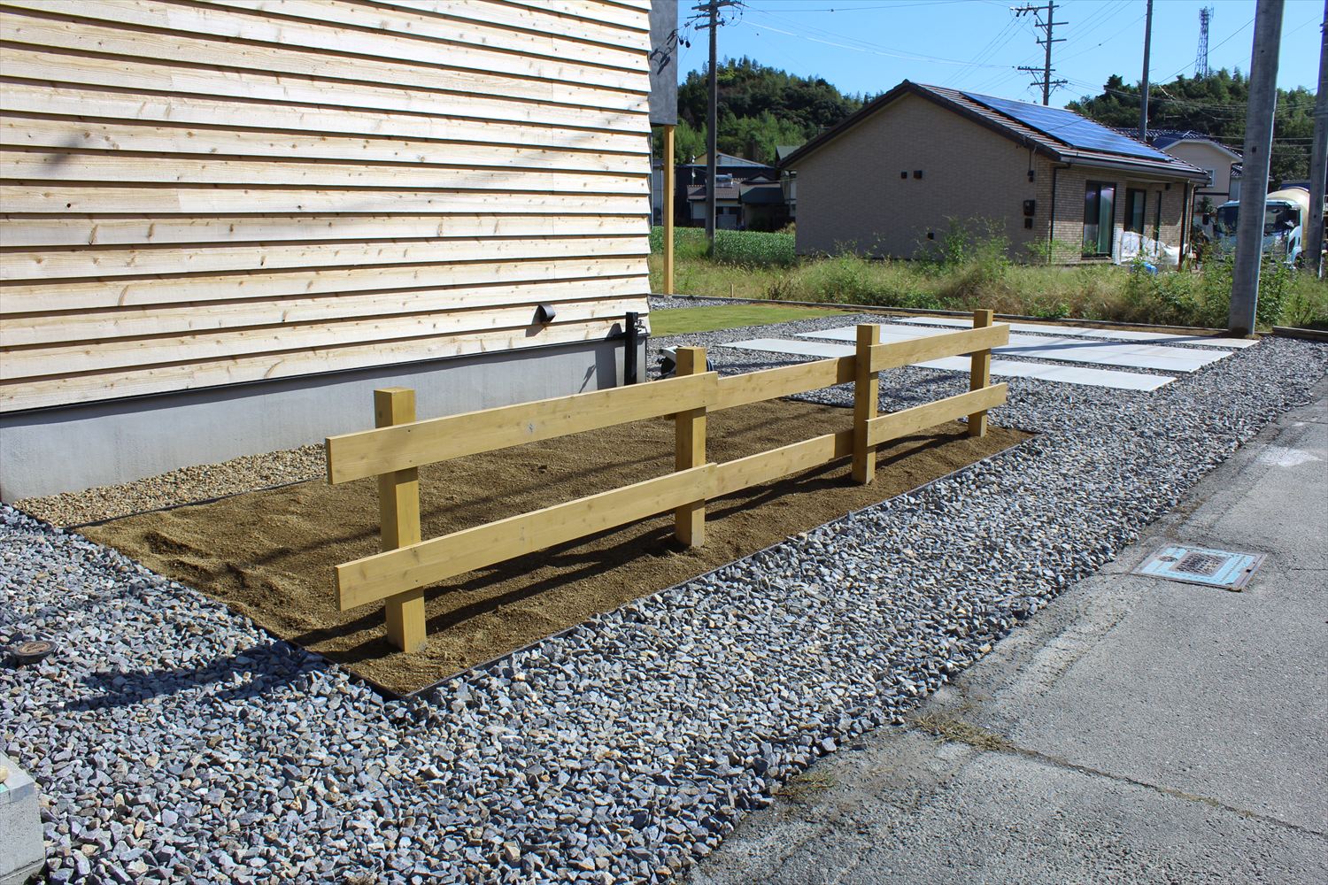 菜園スペースには、下地の砂を入れ、牧歌的な雰囲気のウッドフェンスを施工。