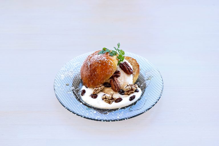 くるみ入りのクリームやホイップクリームを挟み込んだスイーツです。トッピングのレーズンやナッツが
