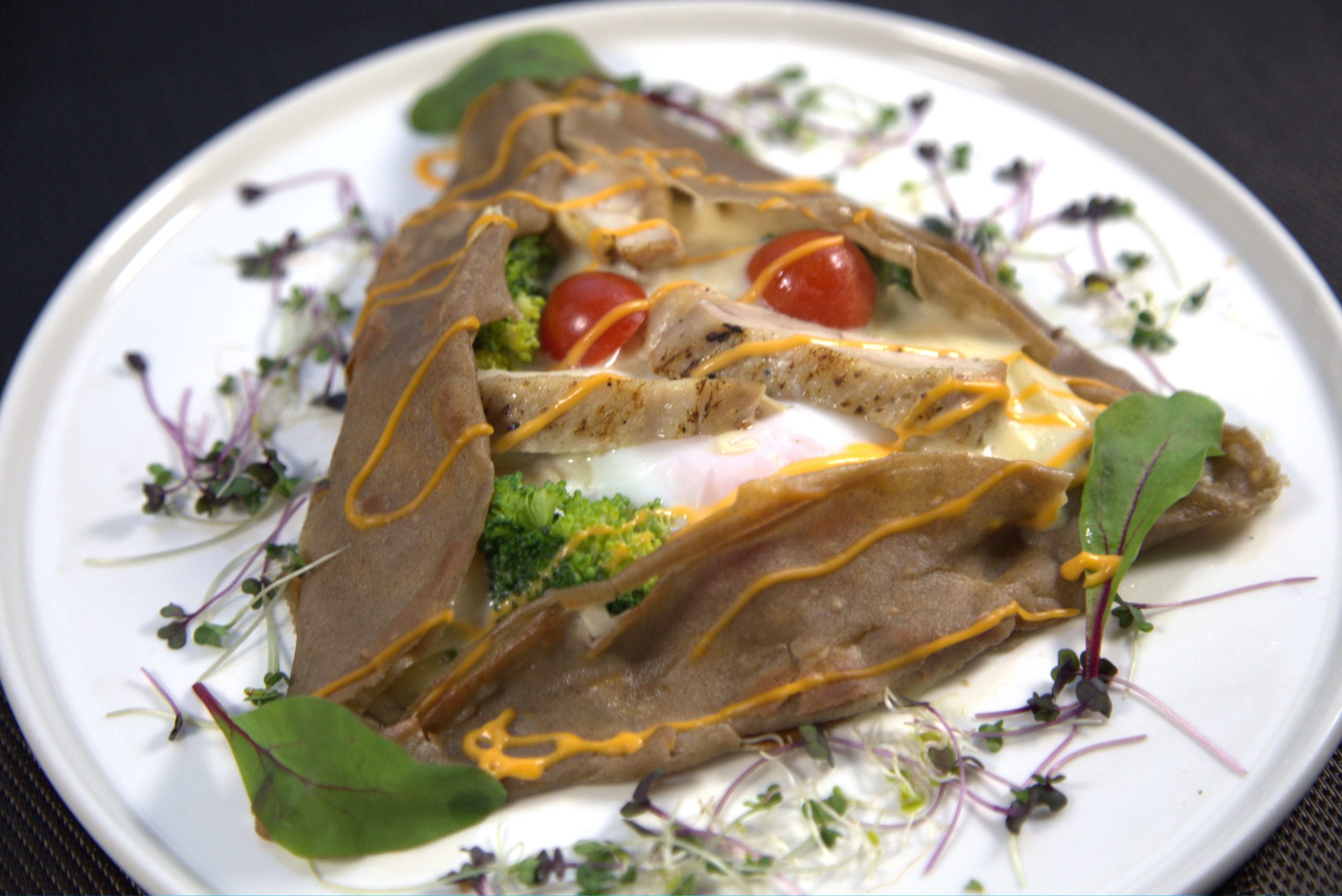 ガレット生地の中にはお野菜やグリルチキンを包んで焼き上げており、ボリュームたっぷりで一皿でしっかり満足感を