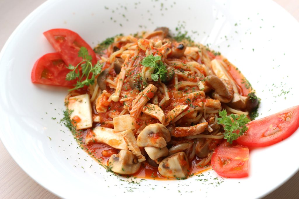 5種類の木の子をたっぷり使用した誰でも食べやすく人気のトマトパスタです。