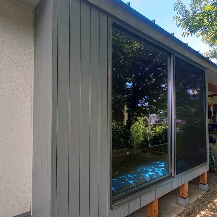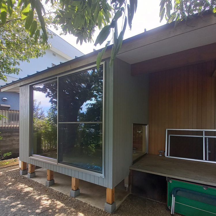 元の建物と同じく、外壁には杉材を使用。外観の統一感を保ちつつも、