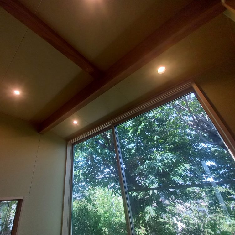 畳に座った際の目線に配慮し、天井には埋め込み式のダウンライトを採用。