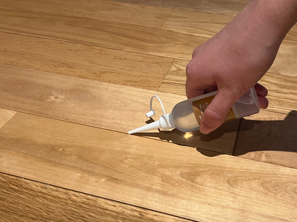 ホームセンターでは、フローリングとフローリングの間(さね)に差し込んで使用する補修剤が販売されています。