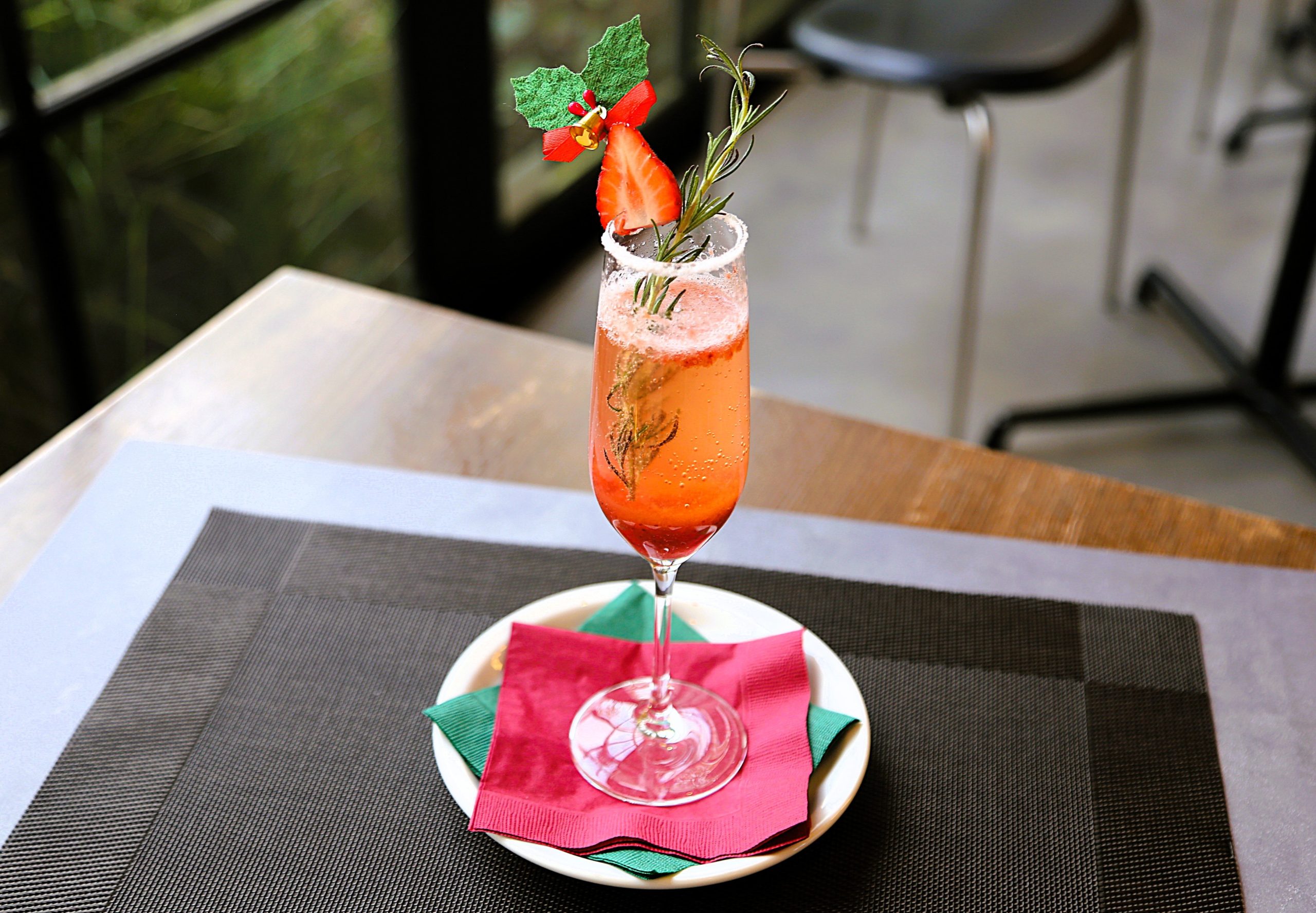 ローズマリーと苺でクリスマスツリーをイメージした華やかなモクテルに仕上げております。