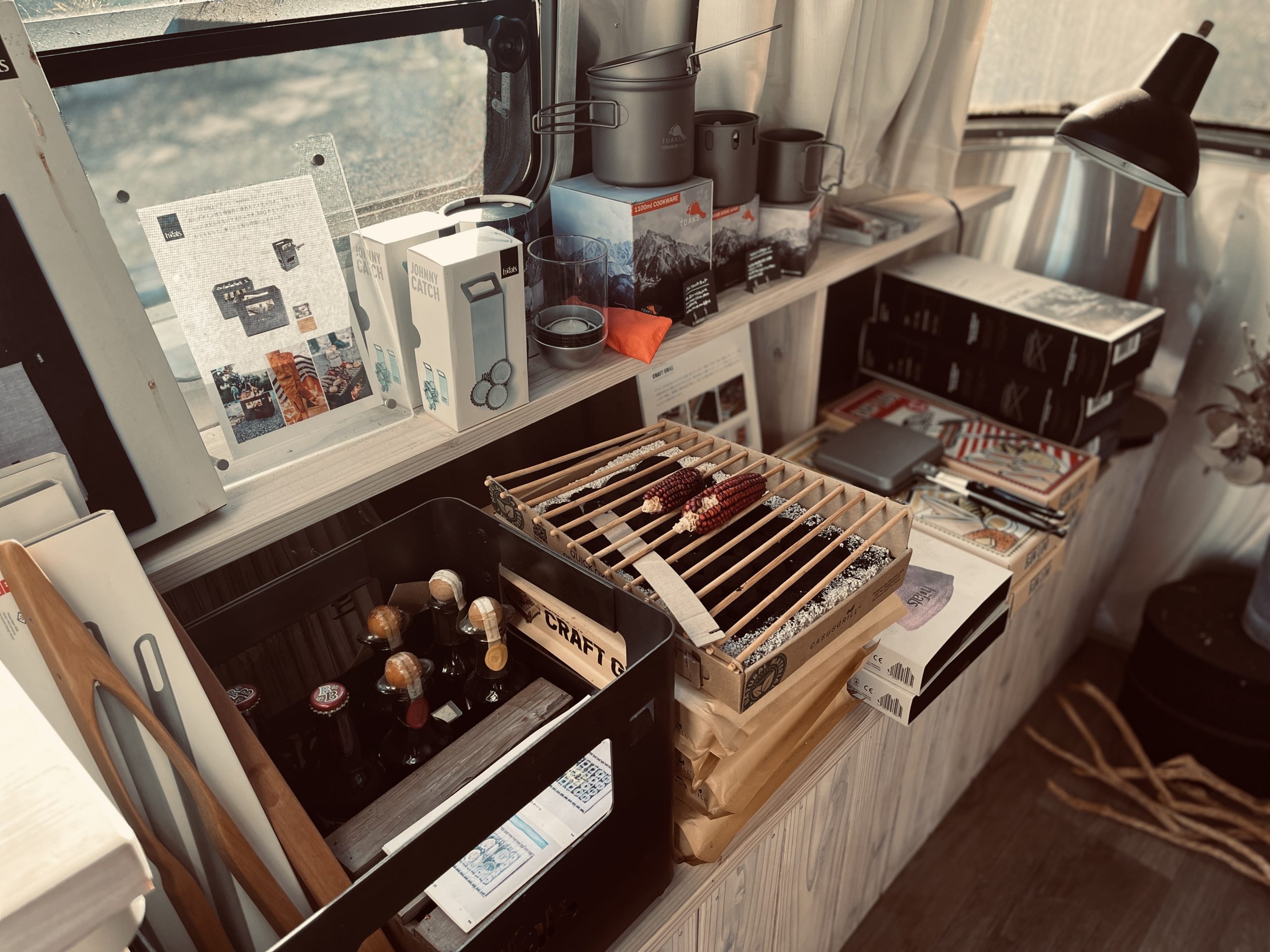 DLoFResCampus敷地内、 蔵で旅するBOOKSTORE前にある銀色のエアストリーム店内にあるキャンプ用品