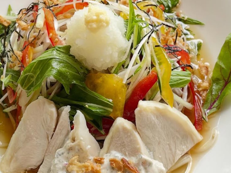 “つめたいお蕎麦 スチームチキン&サワーオニオンソース”