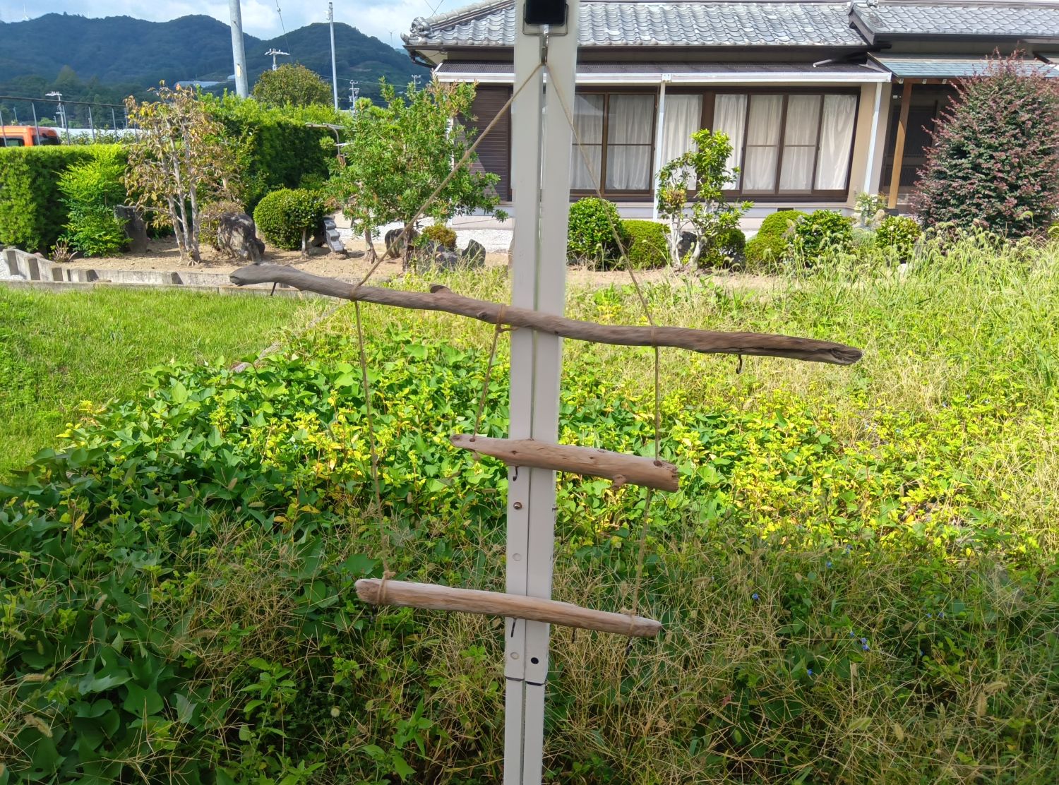 ヨートーといわれるフックを流木に差し込み、鍵やちょっとした小物を掛けられるようにしました。
